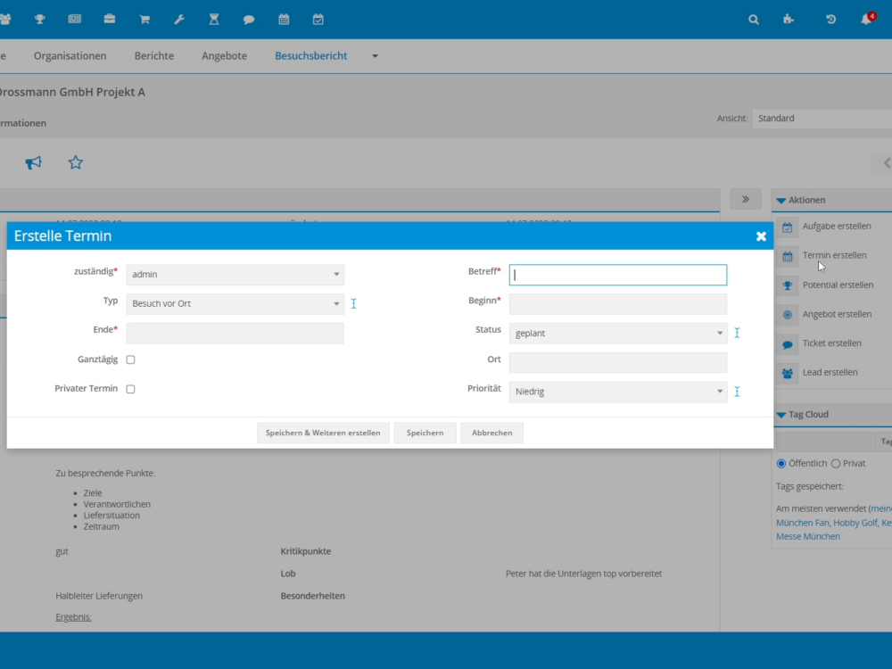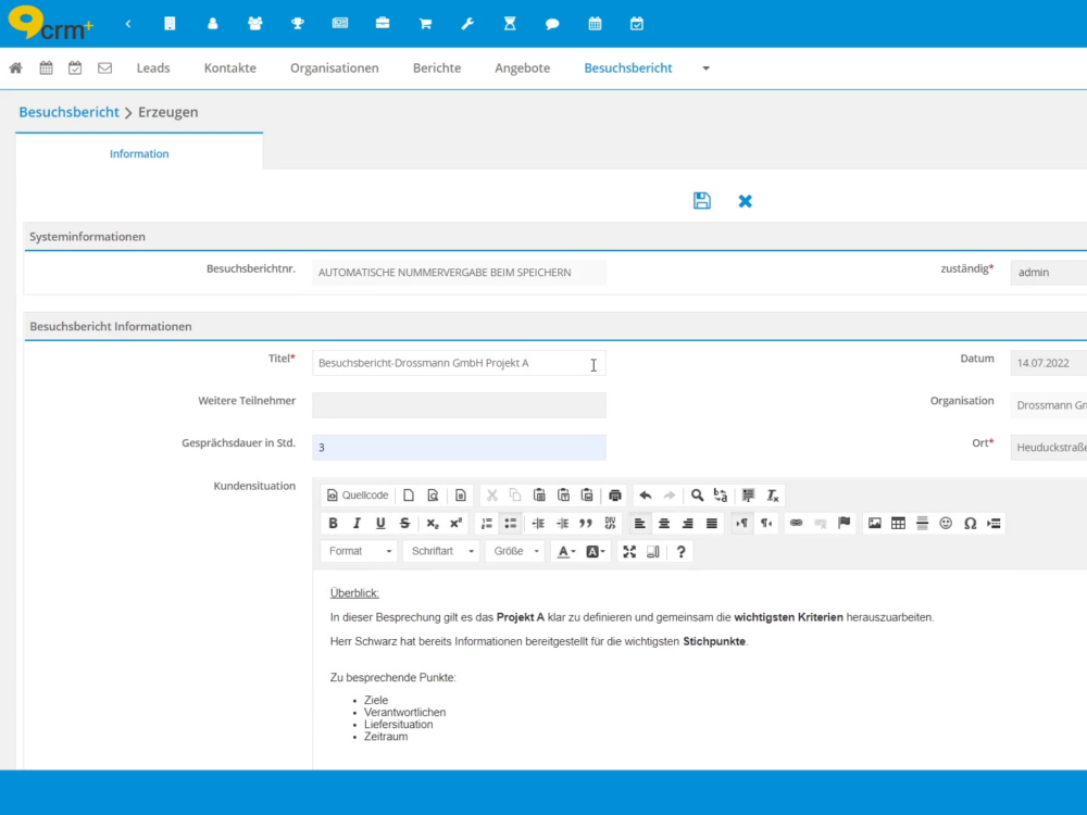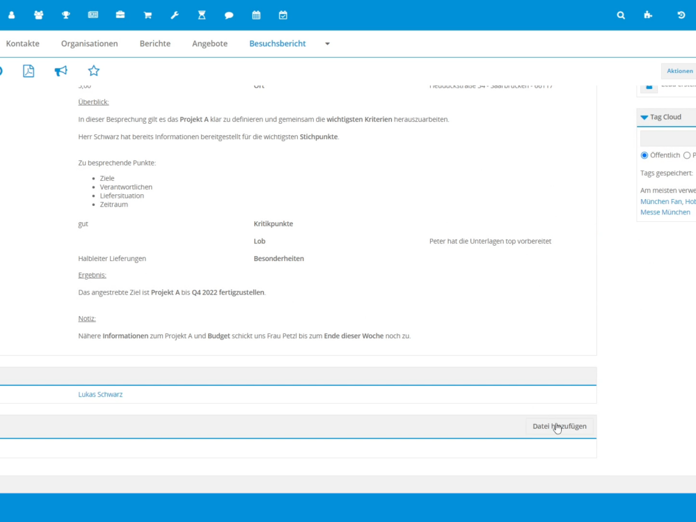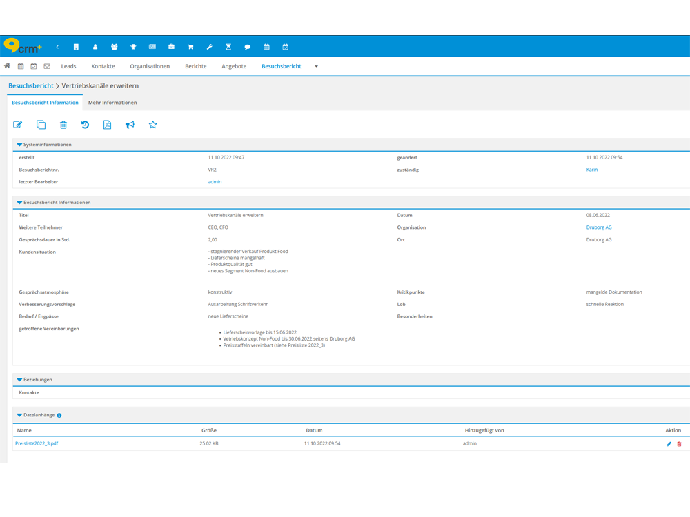 Mit dem Addon Besuchsberichte haben Sie die Möglichkeit durchgeführte Termine im CRM+ detailliert zu dokumentieren. Egal ob Bemerkungen zum Termin oder Gespräch, Vereinbarungen oder aber auch Dokumente, Sie können alle Informationen speichern und verknüpfen. Des Weiteren lassen sich Follow up Aktionen starten, so vergessen Sie nie einen Termin oder Aufgaben mit allen hinterlegten Daten.