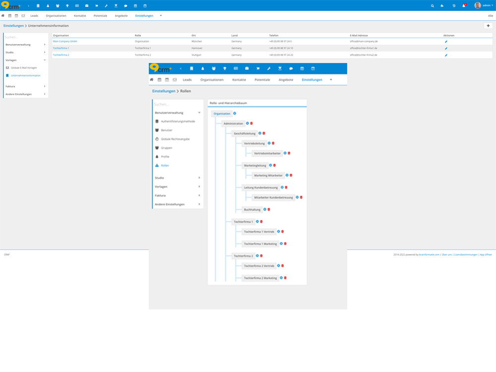 Mit dem Addon Multimandantenfähigkeit können Sie mehrere Unternehmen in einer Instanz von CRM+ verwalten. Hierzu zählen nicht nur die Grunddaten des Unternehmens selbst, sondern Sie können pro Unternehmen einen eigenen Nummernkreis je Modul definieren. Administrative Benutzer haben weiterhin das Recht alle Daten auch mandantenübergreifend zu sehen. Entsprechende Rollenzuteilungen sorgen aber dafür, dass Ihre Mitarbeiter nur auf berechtigte Daten zugreifen können.